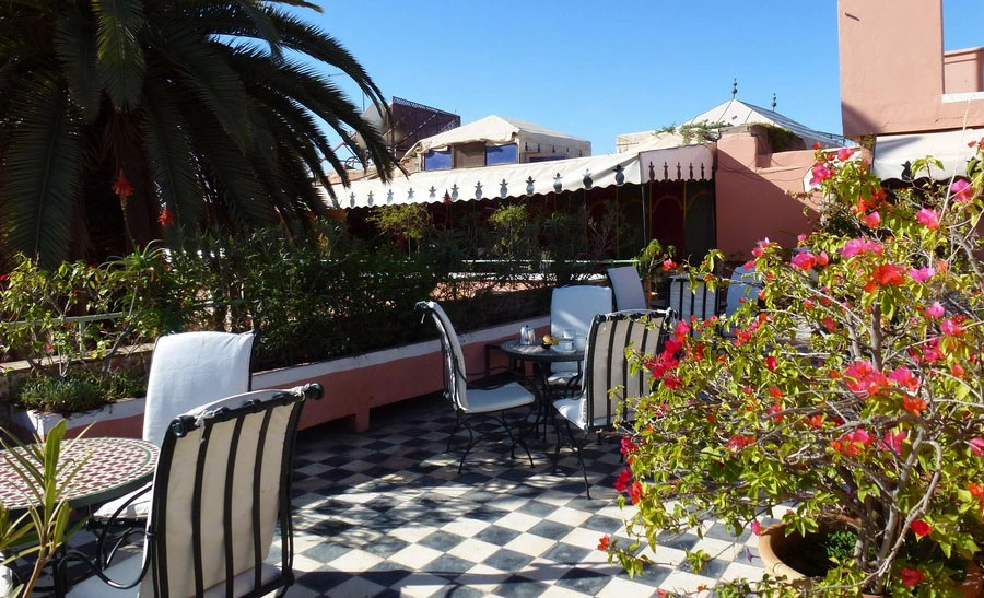 Servi sur la terrasse quand c’est possible. Vue sur la médina et les montagnes de l’Atlas.